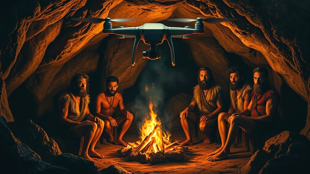 This image depicts ancient men in a cave, surprised by a hovering drone. The scene blends primitive elements with expressive, futuristic, and earthy artistic styles.