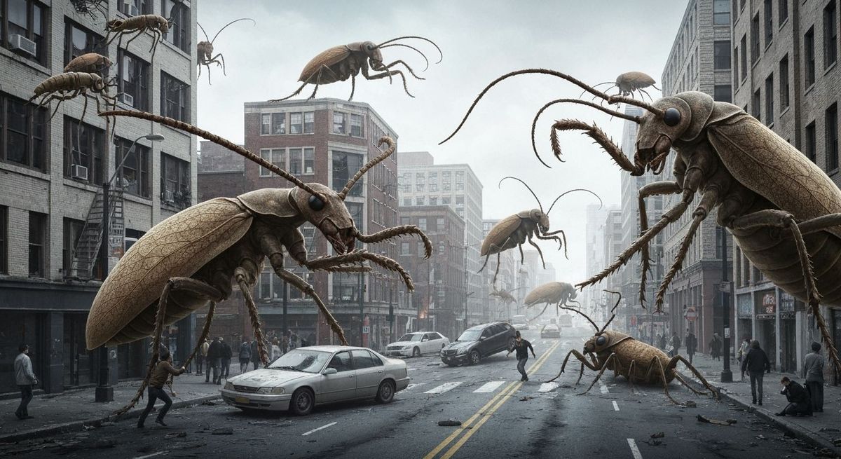 This image shows a modern city under siege by giant Carboniferous insects. The scene depicts overturned cars and damaged buildings, with humans reacting to the bizarre invasion, all rendered with crisp details and sharp lighting.