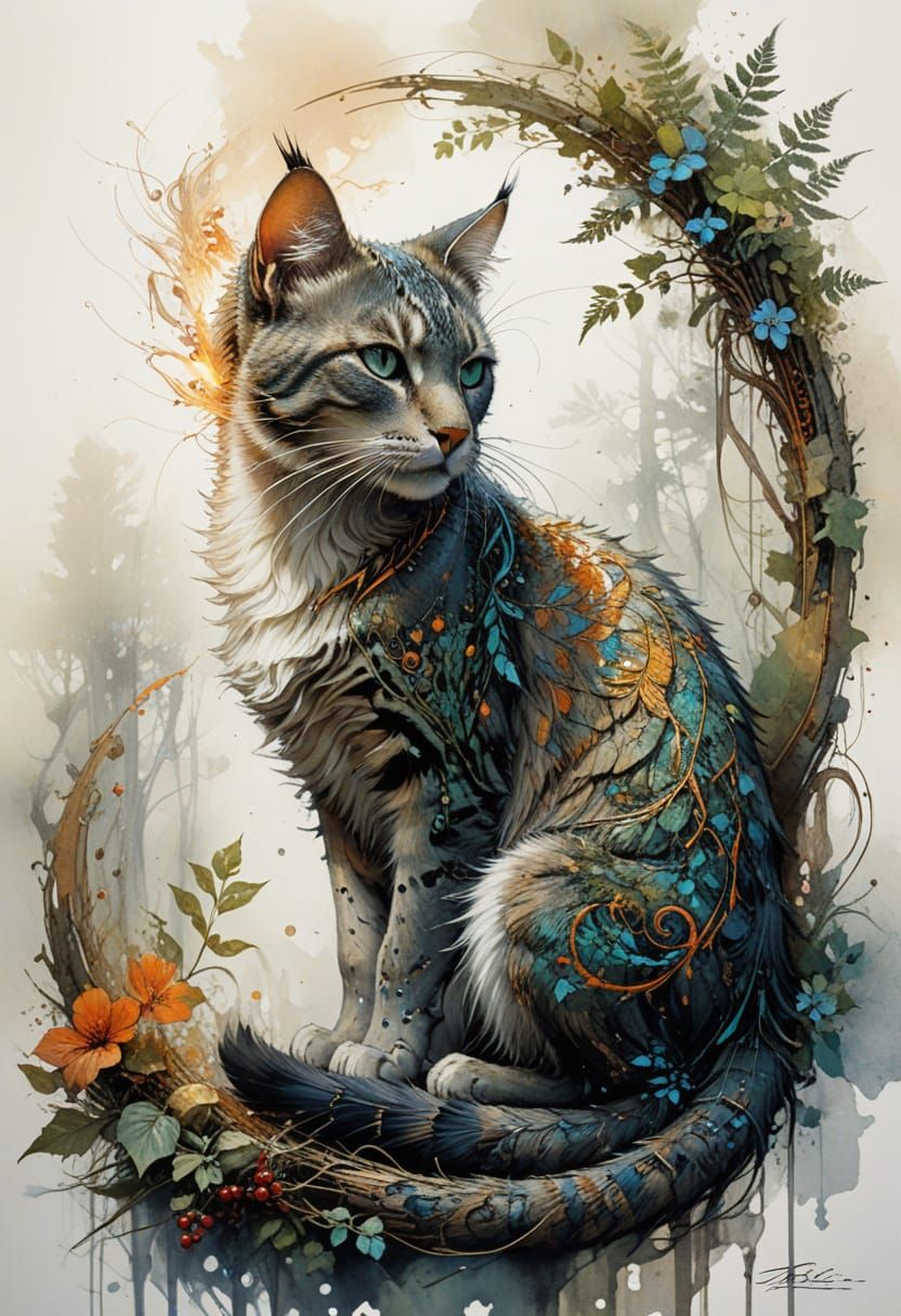 A vibrant ink drawing of a mystical cat in a forest setting. The artwork features Celtic and tribal patterns, dynamic lighting, and surreal elements in a pop art style.