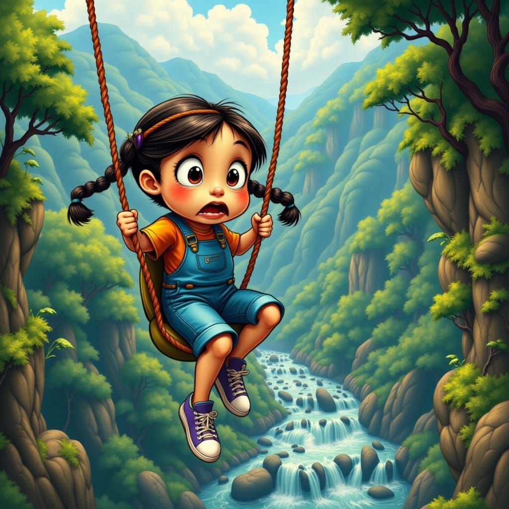 A vibrant image of a child riding a zip line across a jungle valley. The artwork features bright colors and emotive character design, rendered with futuristic details.