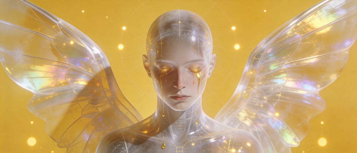 This image shows a spectral being with translucent wings crying glowing golden tears on a minimalist yellow background. It conveys deep sadness and vulnerability in a solarpunk aesthetic with subtle geometric details and melancholic beauty.