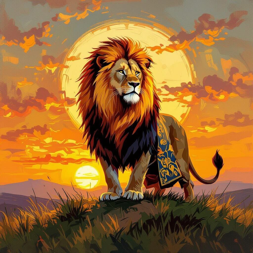 This image shows a lion with a fiery mane standing on a hill at sunset. The artwork exhibits bold brushstrokes and vibrant colors, reminiscent of fauvist paintings.