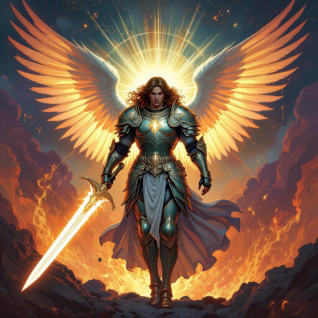 A dramatic image of Archangel Michael in armor, holding a glowing sword, set against a fiery sky and radiant wings. The image is reminiscent of comic book art with dynamic brushstrokes.