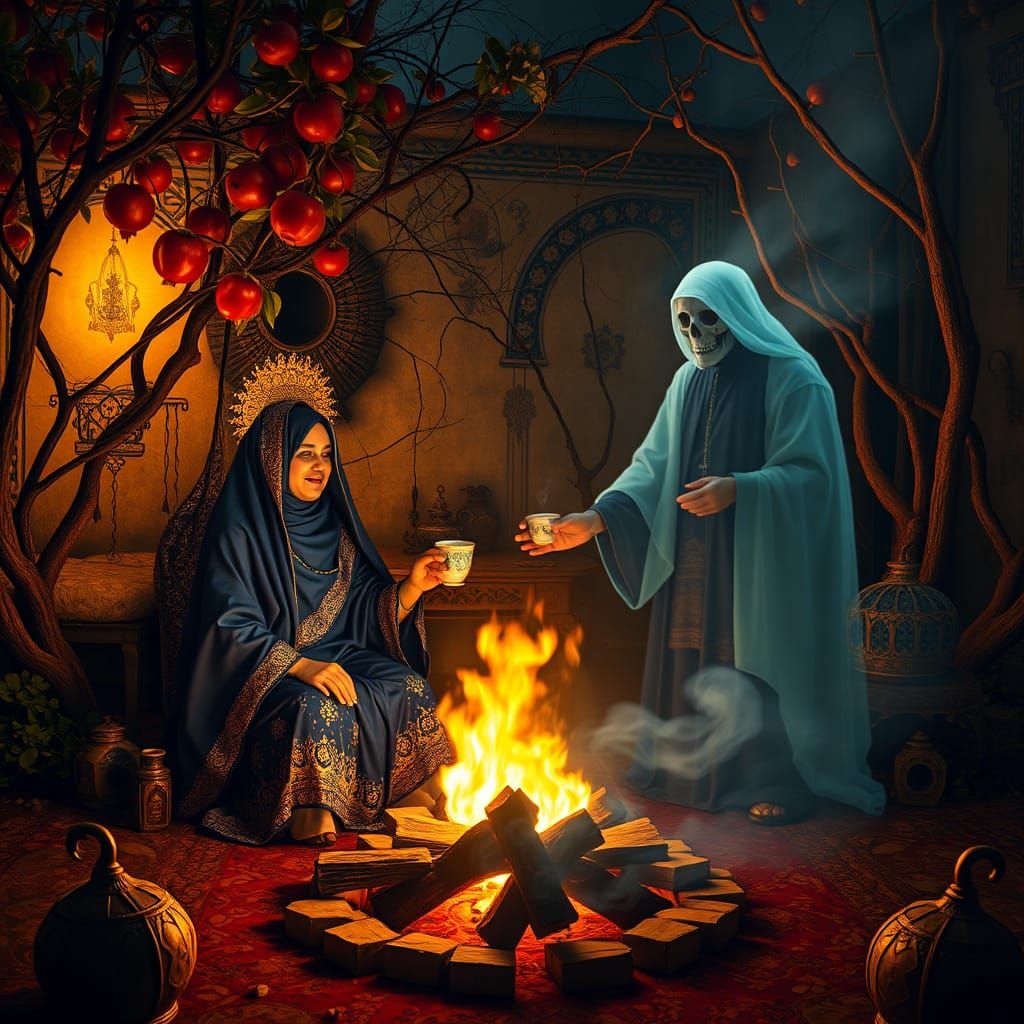 A striking picture of an Iranian couple in traditional clothing sharing tea by a bonfire. A ghostly figure in period robes tends the flames in a derelict garden, rendered with intricate details and a mystical atmosphere.