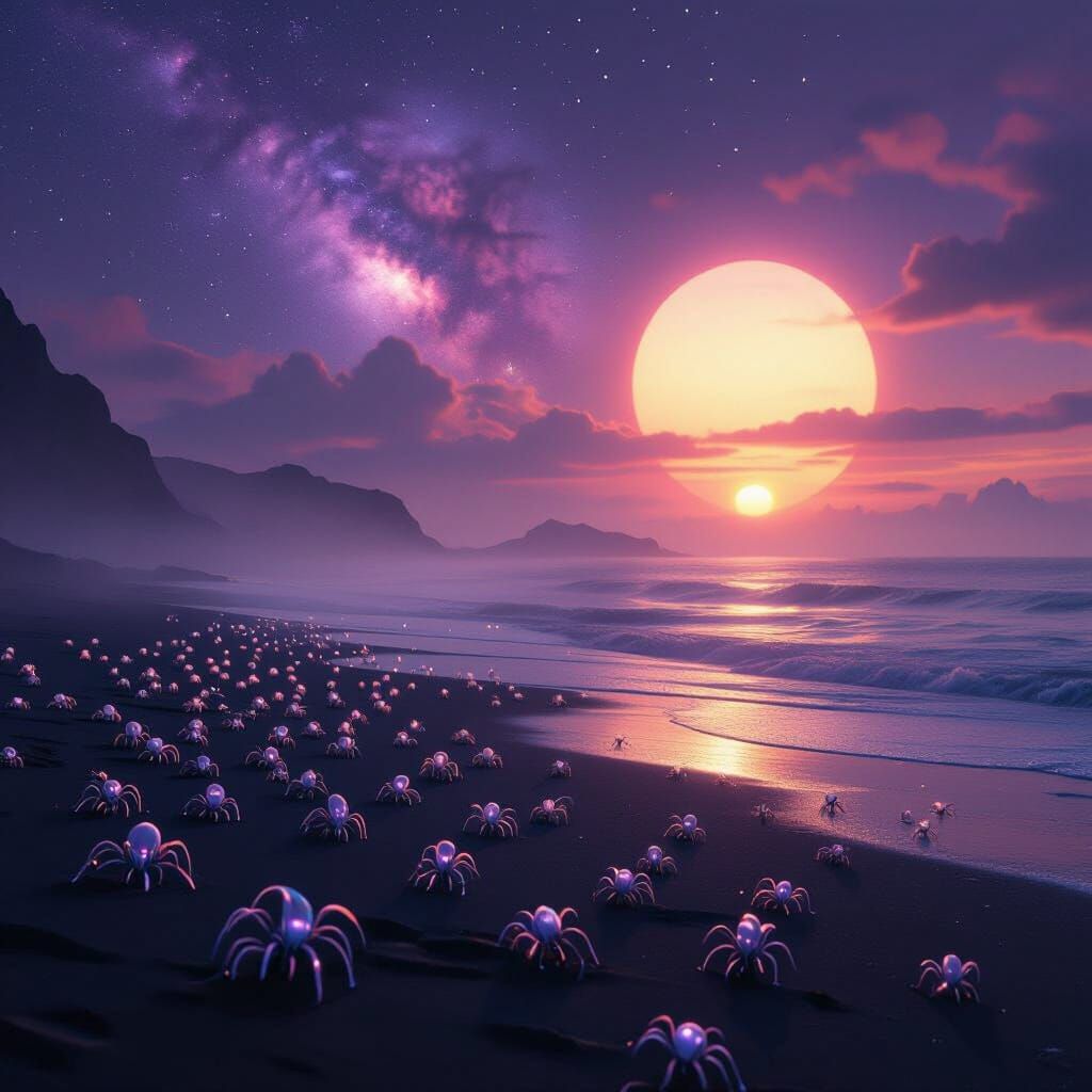This hyper-realistic image captures a misty alien beach with black sand under a vibrant purple and orange sky. Tiny bioluminescent creatures swarm the shore, illuminated by a distant galaxy and exotic sun.