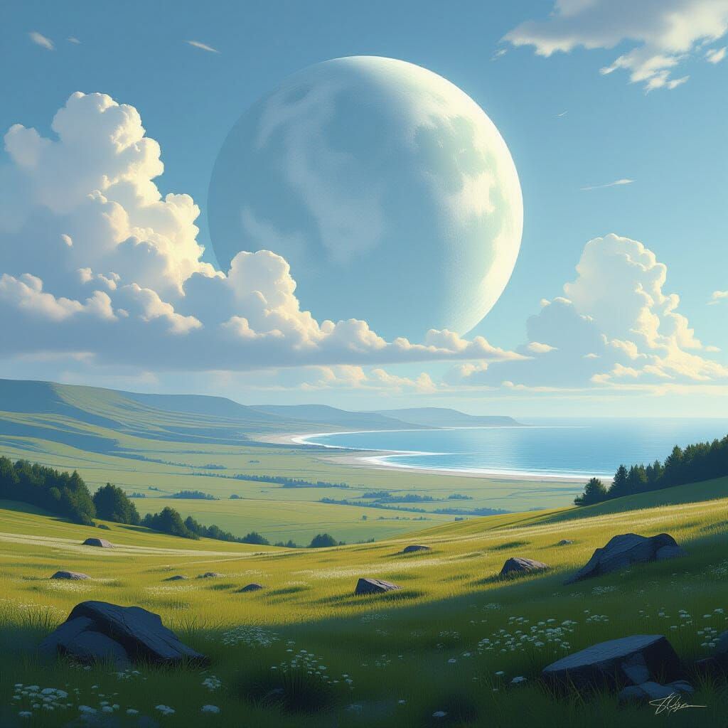 A scenic view of Evas, a terrestrial moon featuring grasslands, hills, and woodlands. The art style evokes the atmosphere of science fiction concept art.