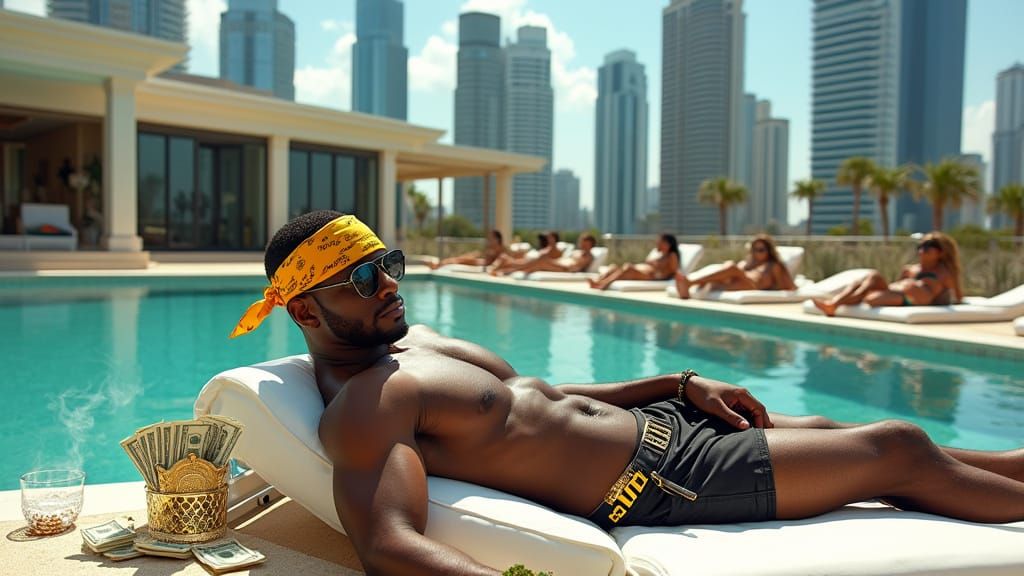 A suave Black man lounges on a sunbed, surrounded by opulence and beautiful women, with a UFC championship belt and firearms nearby, set against a stunning backdrop of modern skyscrapers and a lavish villa pool.