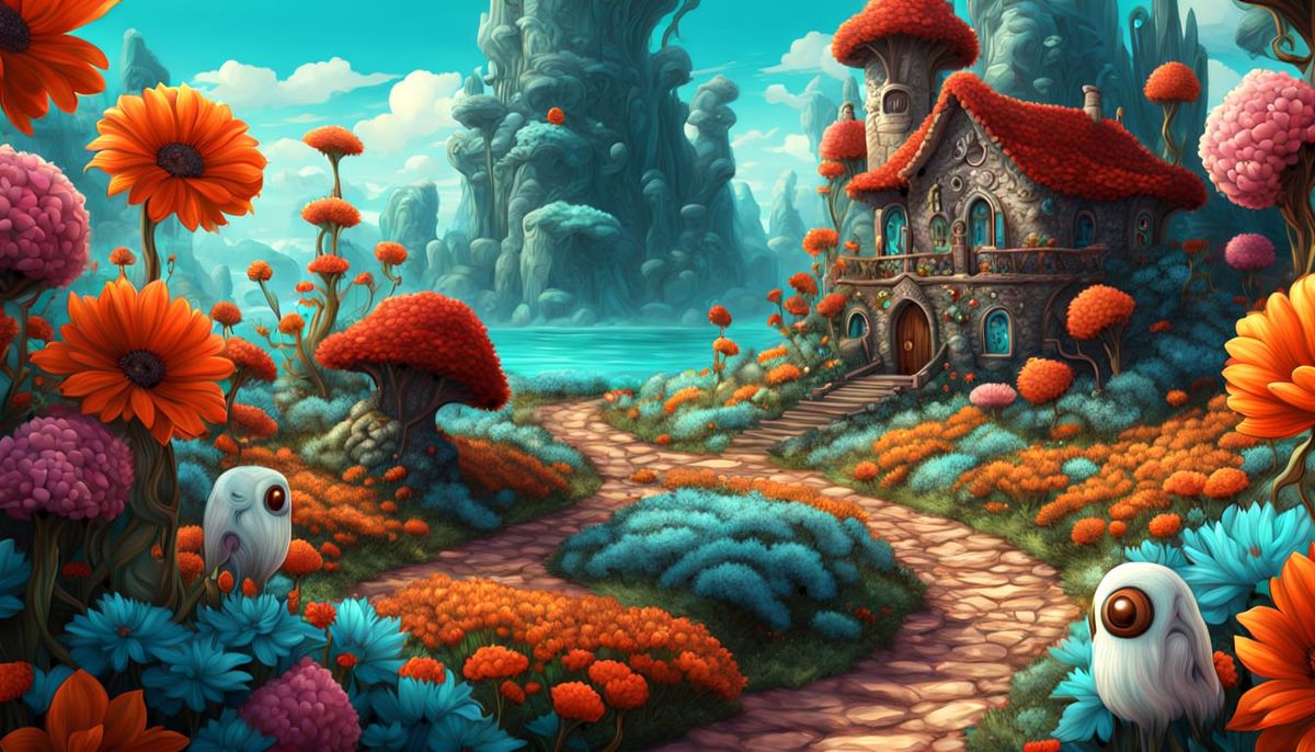 This image showcases a fantastical scene of a man amidst a doodle flower garden, with vibrant colors, intricate patterns, and a sense of wonder. Created in a style reminiscent of Tim Burton's whimsical illustrations, with a focus on detailed, swirling patterns and warm, golden lighting.