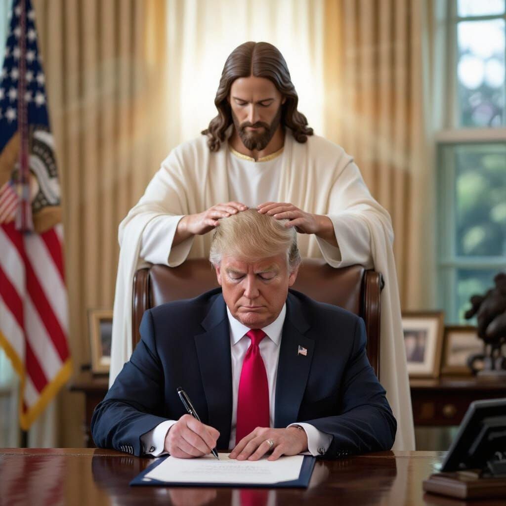 A realistic image shows President Trump at the Resolute desk in the Oval Office. A gentle, ethereal Jesus figure stands behind him in a comforting gesture. The artwork features soft, ethereal lighting.