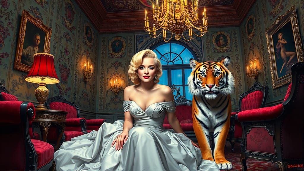A striking picture of Marilyn Monroe in an elegant gown, sitting with a tiger in a Victorian parlor. The image blends comic book art with realism, showcasing vibrant colors and intricate details.