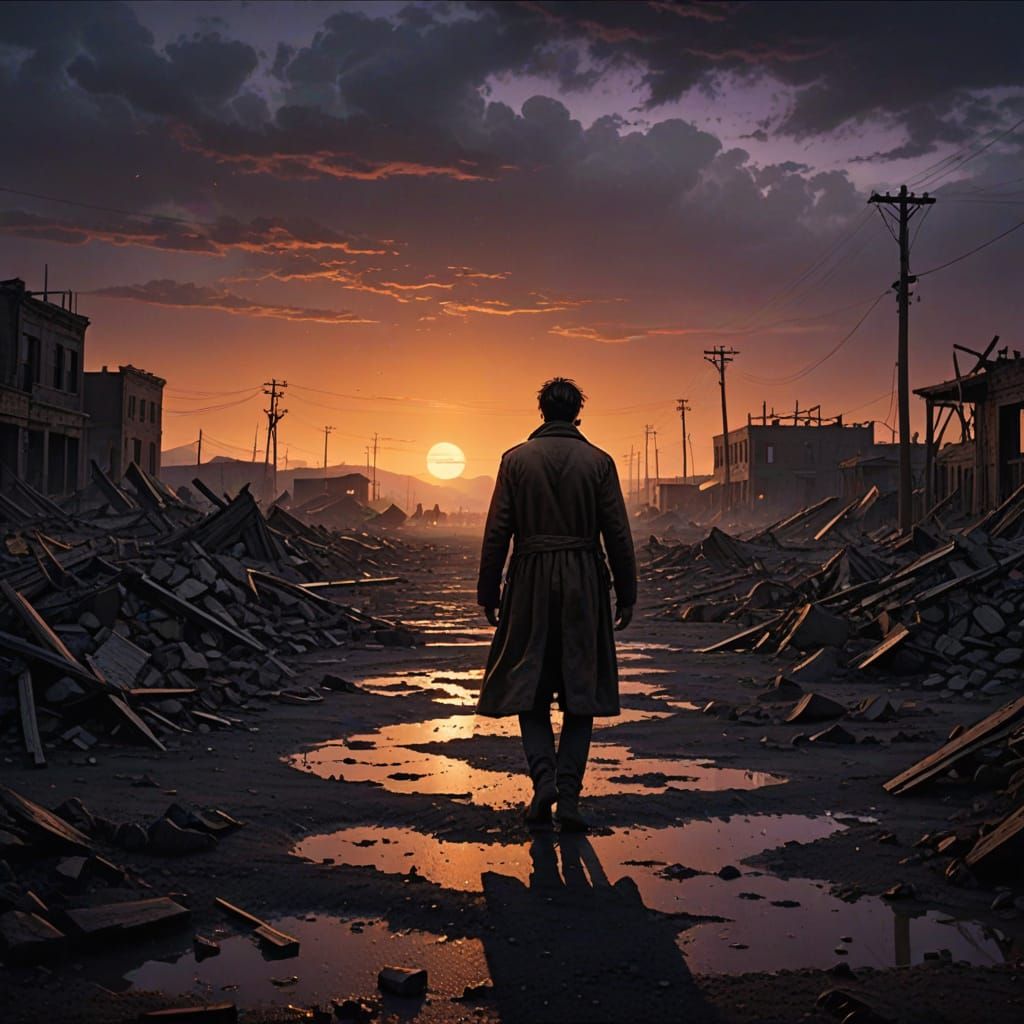 This image depicts a lone figure in a desolate wasteland beneath a dramatic, bruised sky. Cinematic lighting with deep purples and oranges creates an atmospheric, eerie mood.