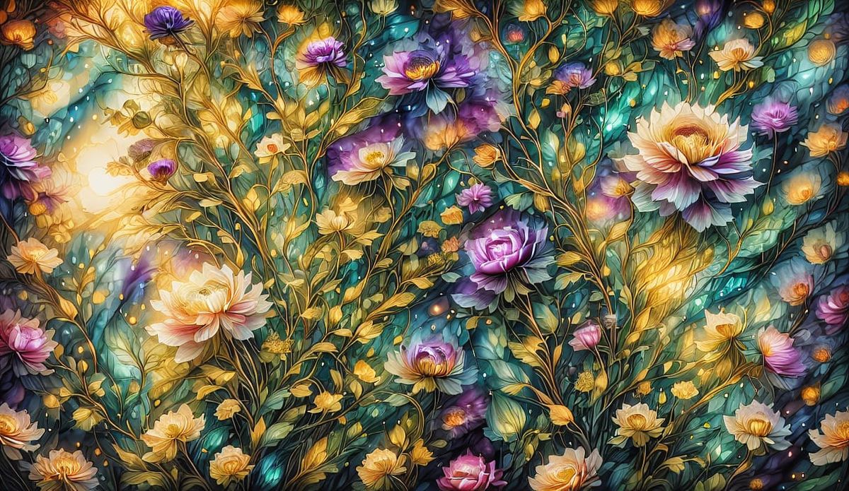 A striking picture of a vibrant bouquet on a windowsill. This macro photograph, rendered in alcohol-ink style, features delicate petals, soft light, and a warm glow, creating a whimsical and serene fantasy illustration.