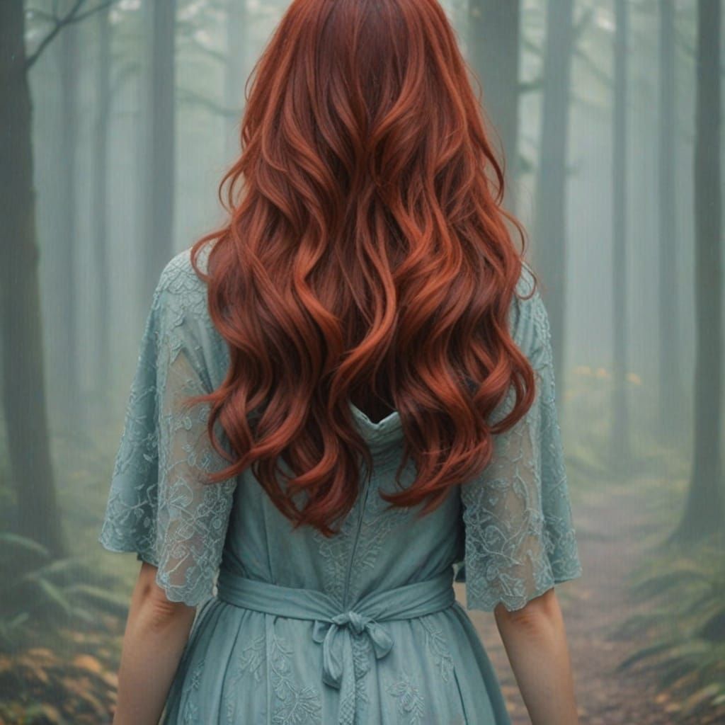 This image shows a girl in a red cloak walking alone in a misty forest, surrounded by warm colors and dappled shadows, evoking a sense of mystery and atmosphere.