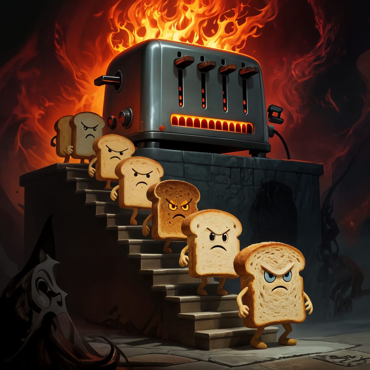 This image depicts a surreal scene where animated toast pieces climb stairs, facing a toaster with glowing, fiery slots. A dramatic and unusual composition.