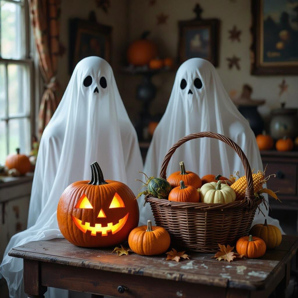 This image depicts a nightmarish haunted house scene with ghosts surrounding a wicked jack-o-lantern and a rustic basket of autumn harvest bounty. Rendered in a thick, textured oil and acrylic painting style.