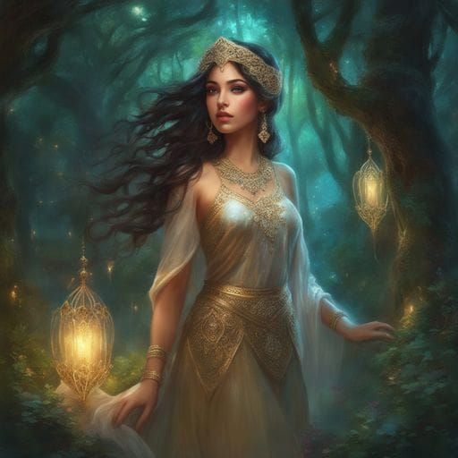 A digital painting of a beautiful Muslim girl with a glowing face in a dark, magical forest. The artwork features detailed character work and a captivating pose.