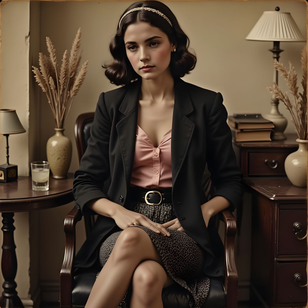 This image shows a young woman in a thoughtful pose at a table. She is dressed in stylish clothing and sits in a softly lit room, creating a serene and introspective mood in a vintage photo style.