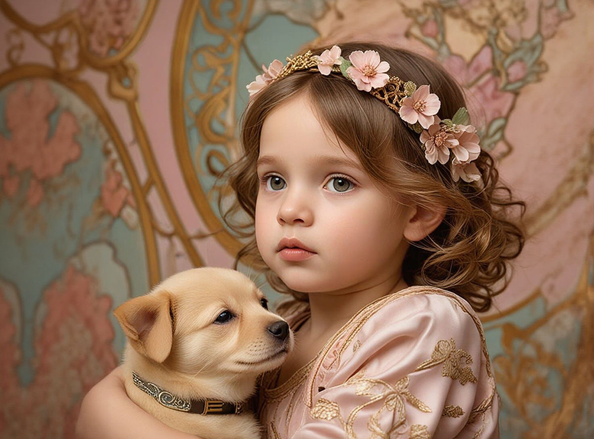 This image depicts a baby girl with black hair and green eyes in a pink dress, joyfully interacting with a white Pomeranian puppy. The scene is set in an opulent royal house with gold and pastel pink accents, rendered in a delicate Art Nouveau style with refined textures.