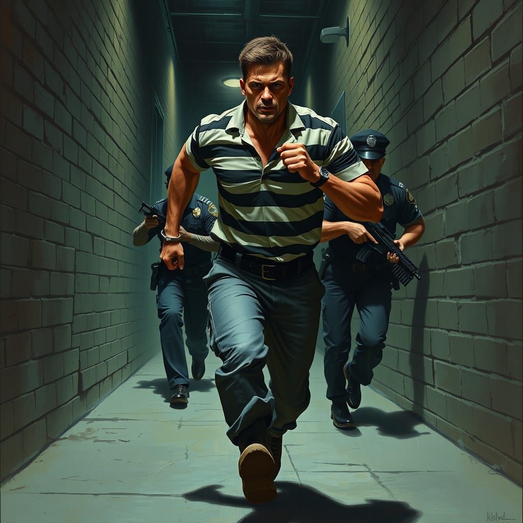 A dramatic image showing a fugitive in a tattered prison uniform and handcuffs fleeing down a dark alleyway, pursued by determined police officers. The artwork has a gritty, comic book aesthetic.
