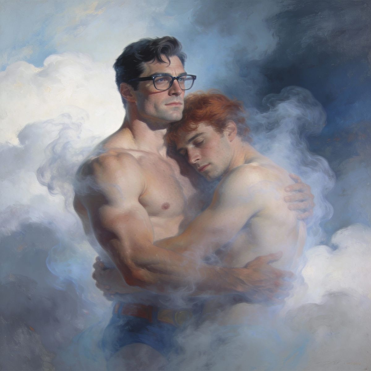 This image shows two men in smoky, translucent forms embracing amidst ethereal clouds. The dreamlike scene features soft lighting and a muted color palette, evoking a surreal and atmospheric aesthetic.