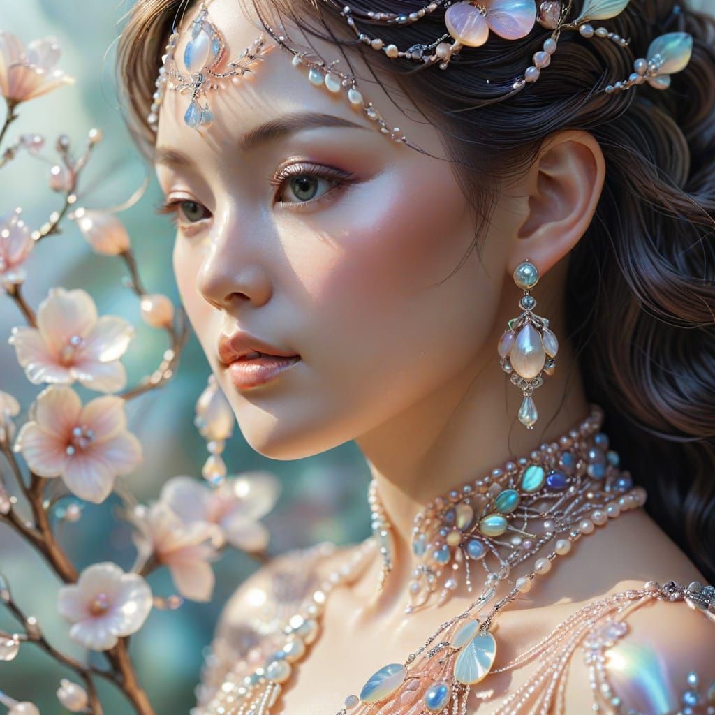 This image shows a close-up of an Asian woman composed of luminous glass beads. The macro photography captures delicate details and shimmering pastel colors with an iridescent finish.