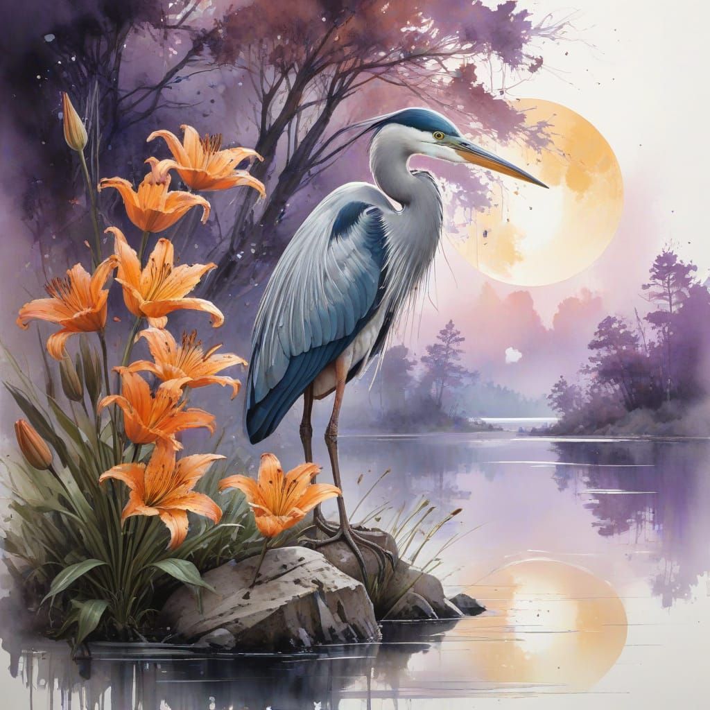 A striking picture of a heron standing on a rock in a lake under a purple sky. The surrounding landscape is dreamlike, with orange lilies and colorful trees, rendered in a fine art watercolor style.