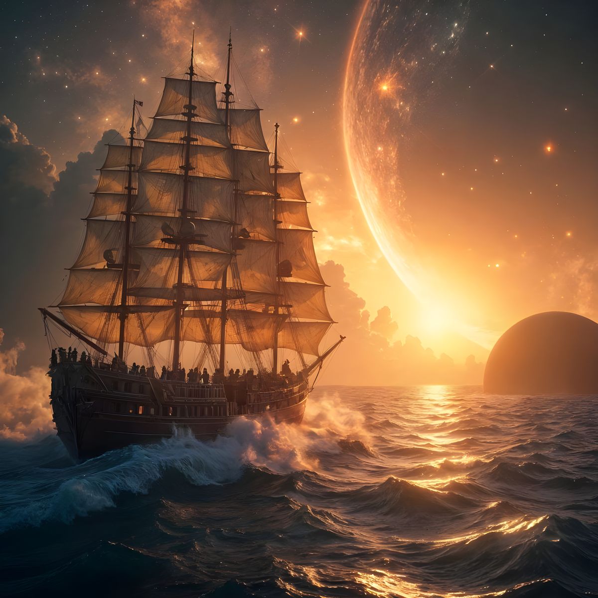 A striking picture of a starship sailing through the cosmos. The ship resembles a galleon with sails made of stardust. A diverse crew gazes towards glowing alien planets in a cinematic, magical scene.