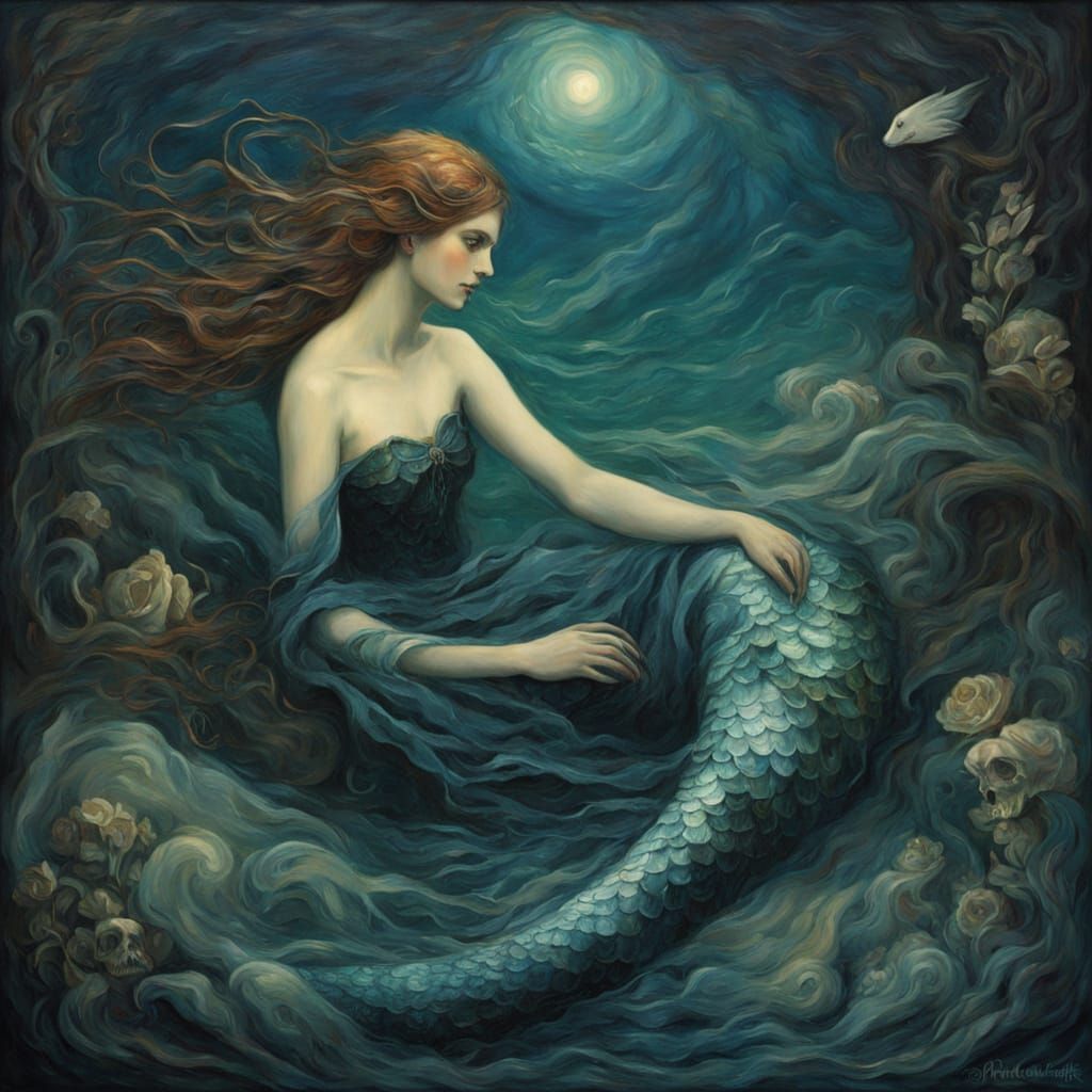 This oil painting depicts a mermaid claiming a swimming lad in dark, swirling ocean depths. Inspired by Pre-Raphaelite art, it features delicate scales and haunting beauty with dramatic lighting.
