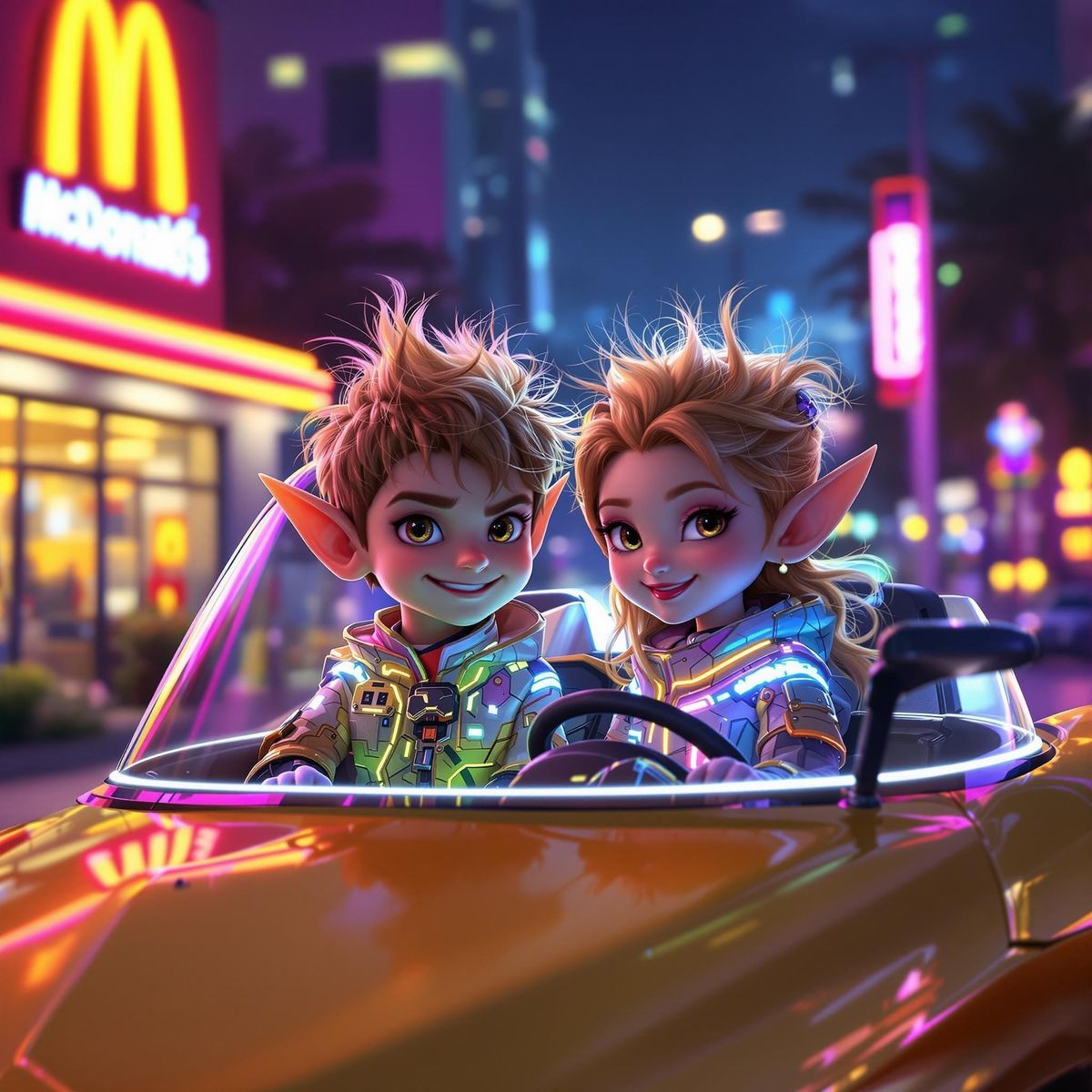 This vibrant digital art depicts two mischievous elves in a gold Cybertruck, surrounded by city lights and the bold colors of a McDonald's drive-thru, blending sci-fi and fantasy elements with a touch of nostalgia.