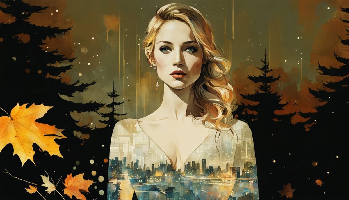 This image features a stunning double exposure effect, blending a vibrant galaxy with a detailed autumn cityscape, complete with falling maple leaves and a princess silhouette.
