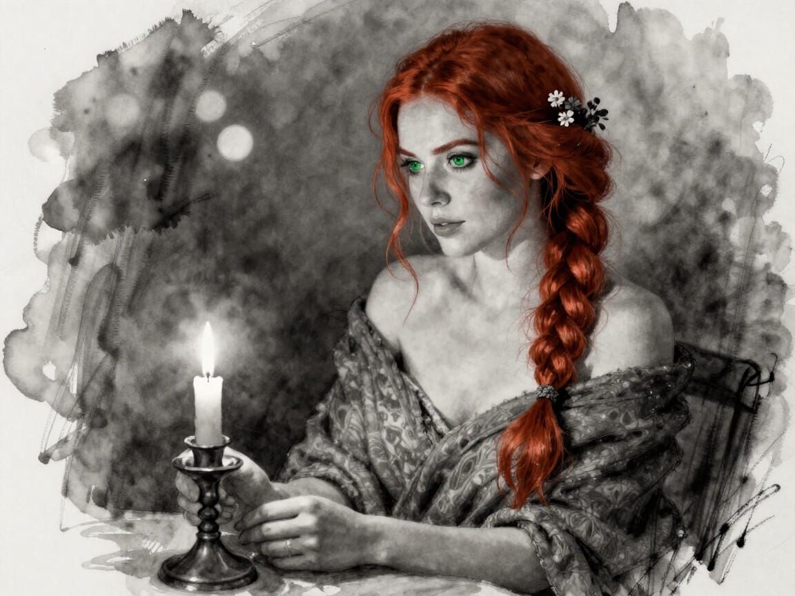 This image features a woman with red hair and green eyes, styled in a braid with flowers, illuminated romantically by candlelight. Rendered as a charcoal sketch with watercolor wash.