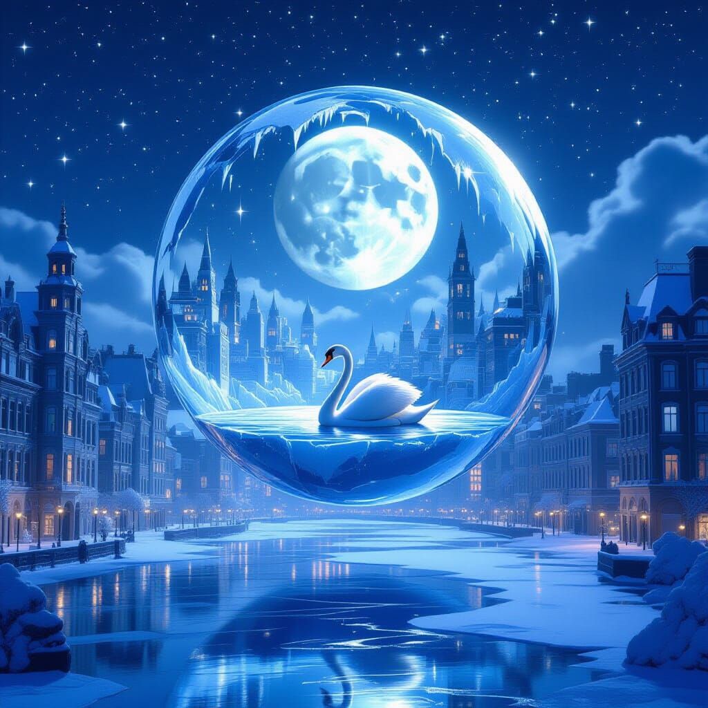 This image shows a giant glass ball hovering over a frozen city under a new moon, with a white swan floating inside. The scene is rendered in a highly detailed matte painting style.