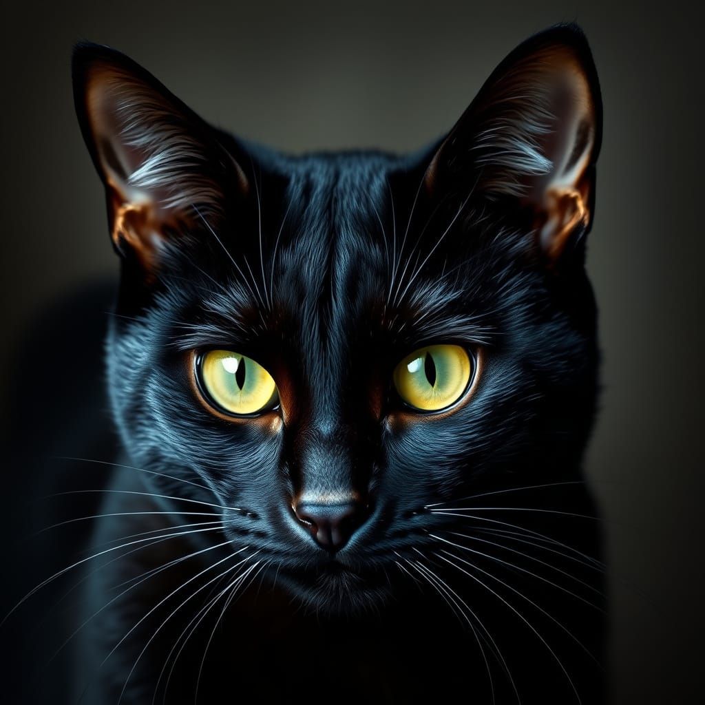 This image shows a photorealistic portrait of a sleek black cat with bright green eyes, set against a subtle background, with a focus on realistic textures and moody lighting.
