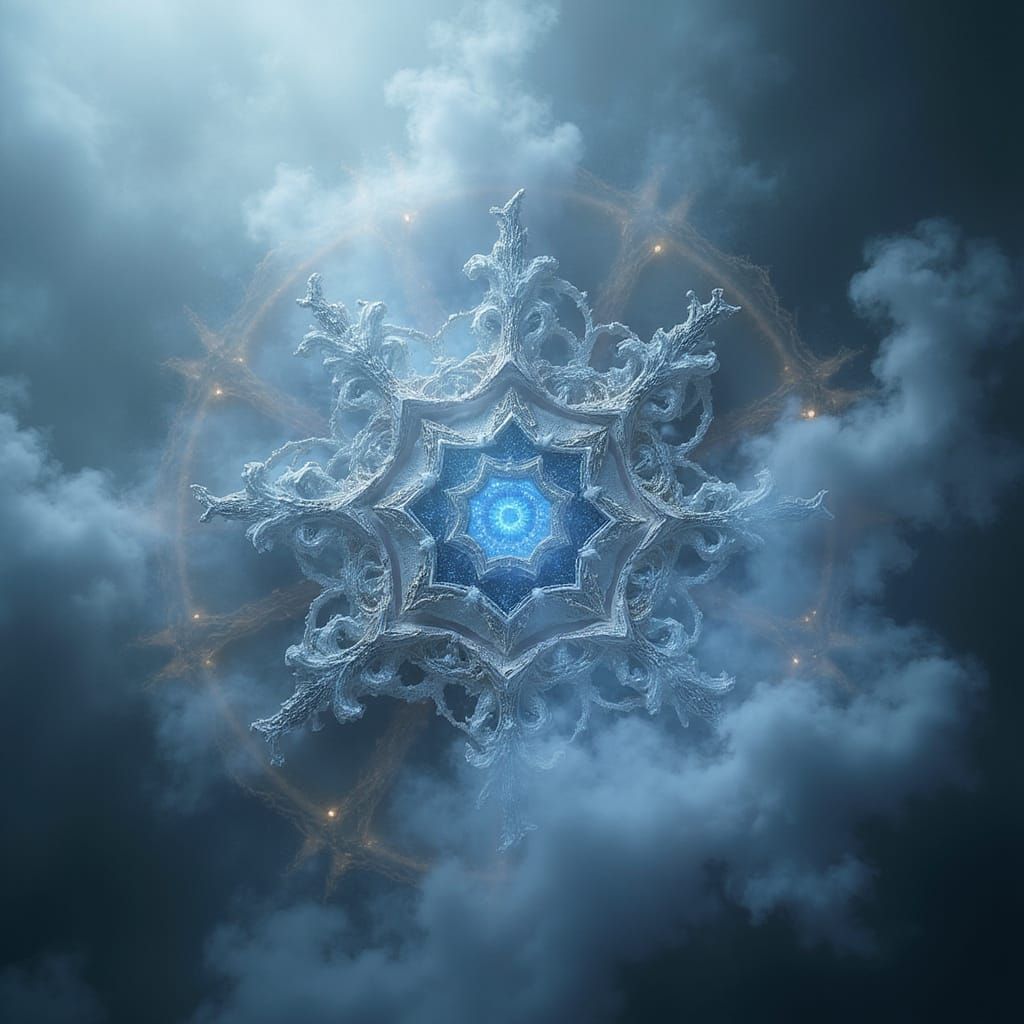 This image features a dreamlike, mystical artwork with soft, glowing mist and intricate, sacred geometric patterns. Organic shapes and fractals blend with the environment, creating a sense of depth and dimensionality, while a central, symbolic fractal shines with a 3D, holographic quality, radiating an o...