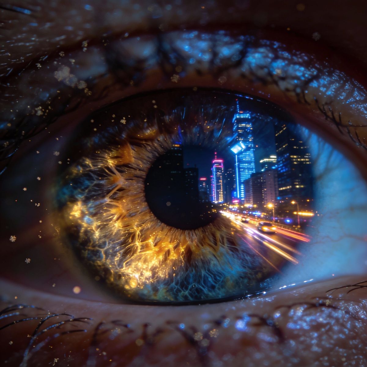 Extreme macro photograph of a human eye. In the pupil, a sharp reflection of a night city skyline with glowing lights. Ultra detailed iris texture, shallow depth of field, cinematic lighting, photorealistic, emotional mood.