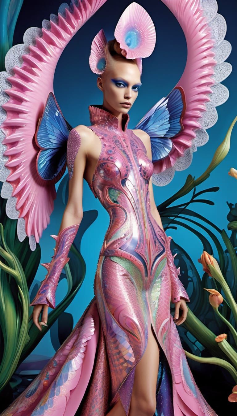 This image depicts fantastical, otherworldly lifeforms and imaginary creatures within surrealist architecture, inspired by renowned designers and architects.