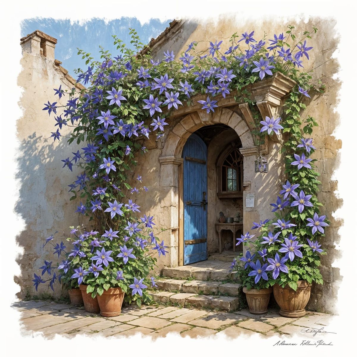 This image shows a picturesque scene of blue clematis flowers thriving around a charming, weathered doorway on a bright, sunny day, reminiscent of a fine art painting with meticulous attention to detail.