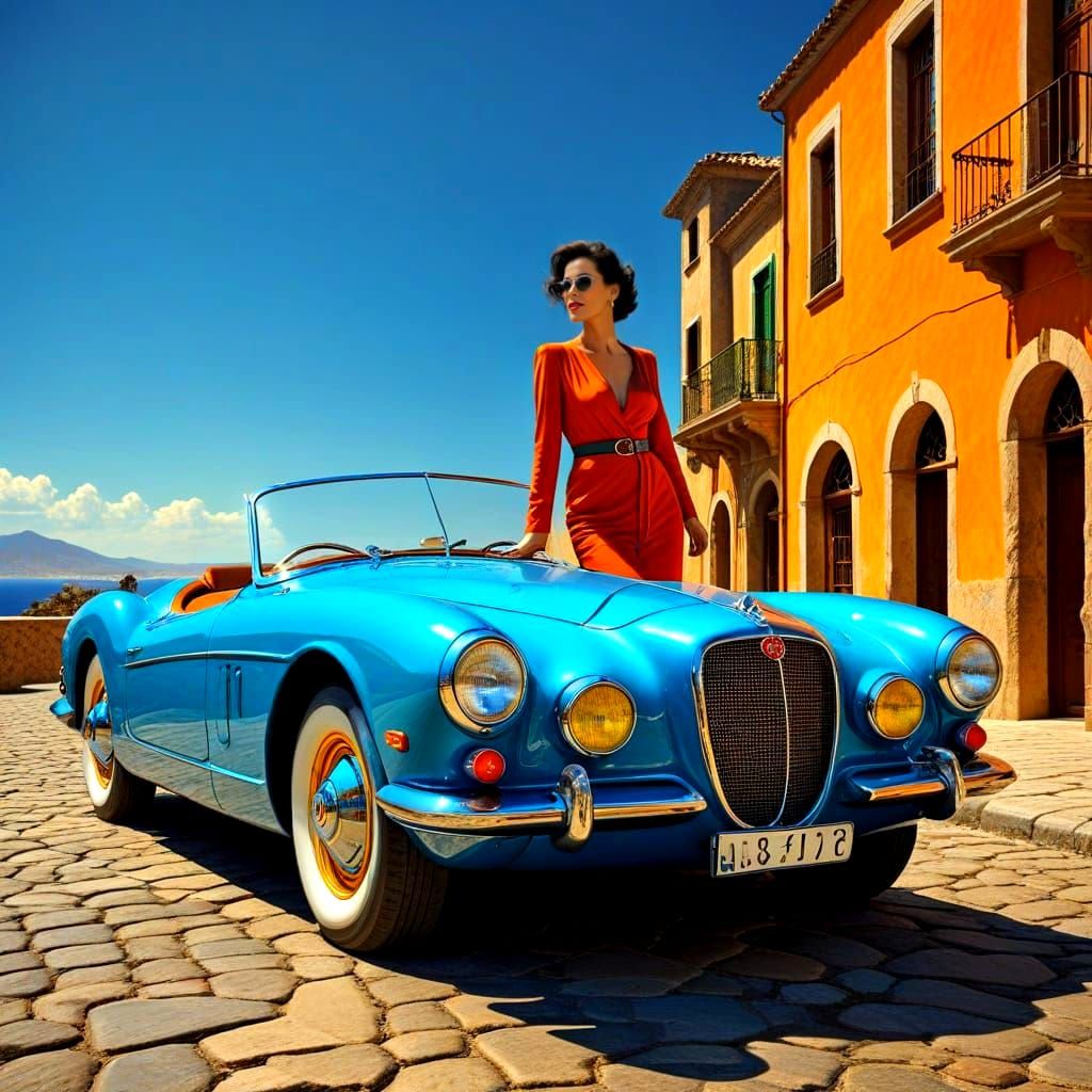 beautiful ladies and exotic antique automobile in fantastic surreal setting, surrealism by Salvador Dali, Max Ernst, René Magritte, Johfra Bosschart, Evandro Schiavone, Patricia van Lubeck, John Blanche, Eddie Mendoza, Rafael Santi, sharp, precise, detailed, colorful polychromatic, intense vivid colors, ...