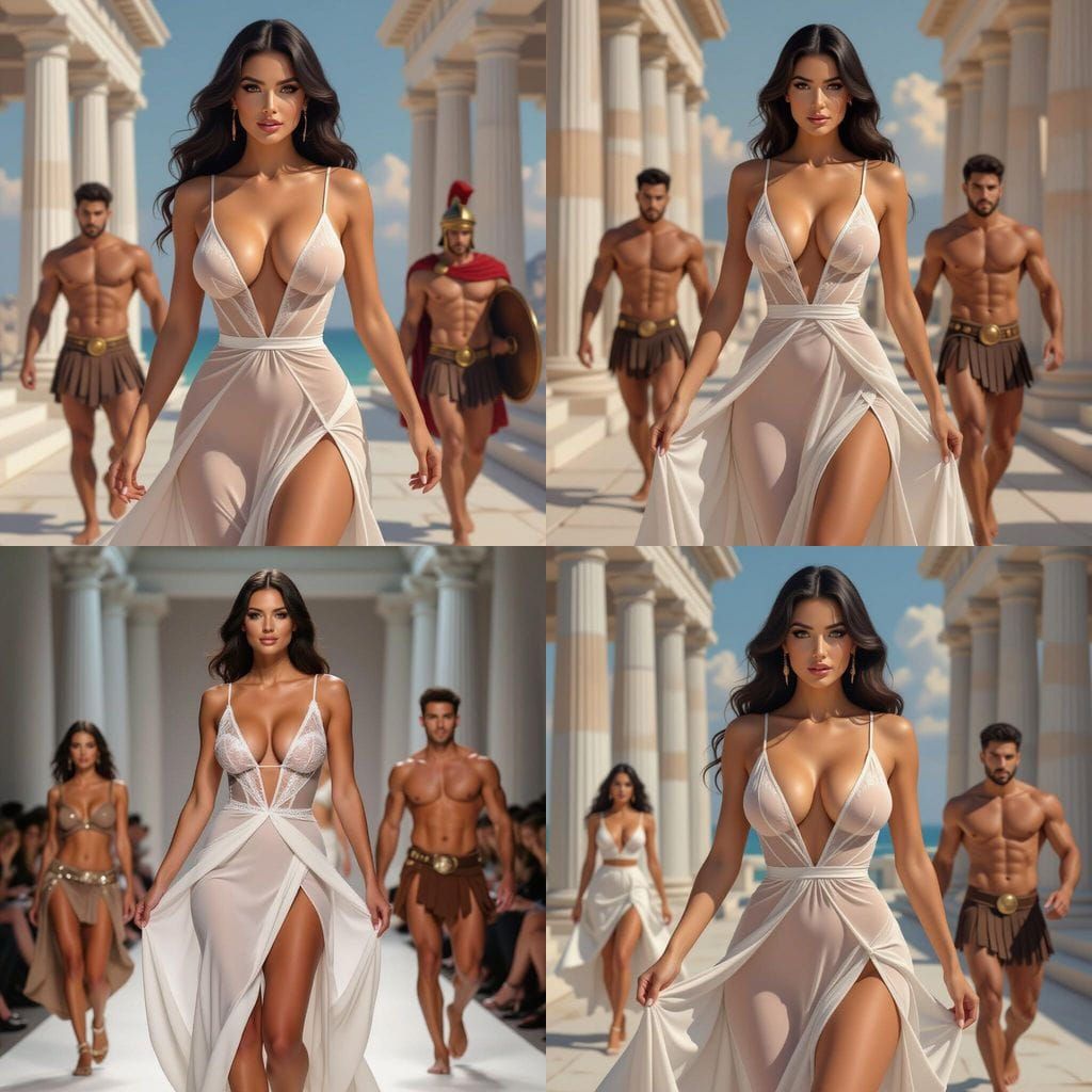 This image depicts a beautiful woman in a revealing dress being pursued through an ancient city. The background features classical Greek architecture, with prominent columns.