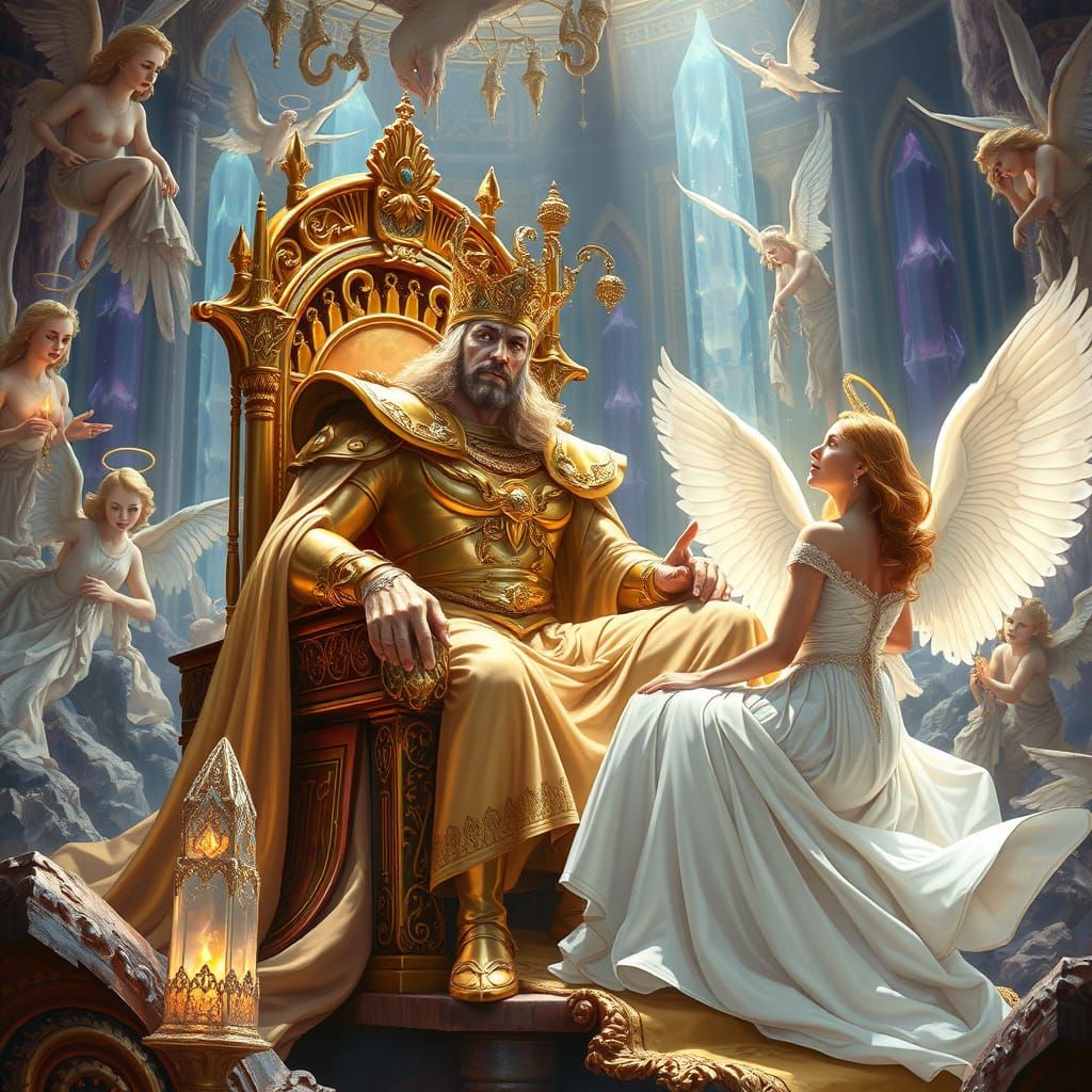 This image depicts a powerful god judging a hopeful woman in a vibrant underworld palace filled with crystals, silks, and angels, reminiscent of epic fantasy art