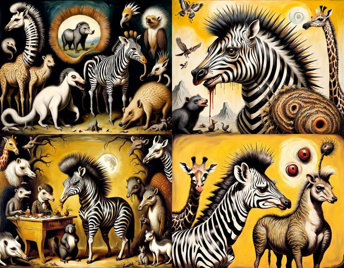 This disturbing image depicts a grotesque creature amidst a lush, African savannah, evoking the surreal and dreamlike quality of 19th-century Romanticism and the works of Dali and Tapies.