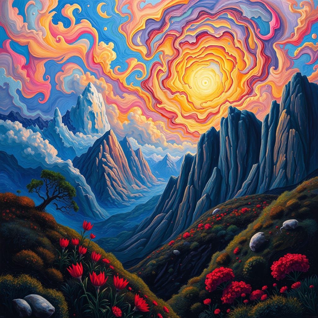 A surreal landscape featuring vibrant colors and intricate details beneath a kaleidoscopic sky. The artwork blends romantic and cubist elements, creating a dreamy and fantastical scene.