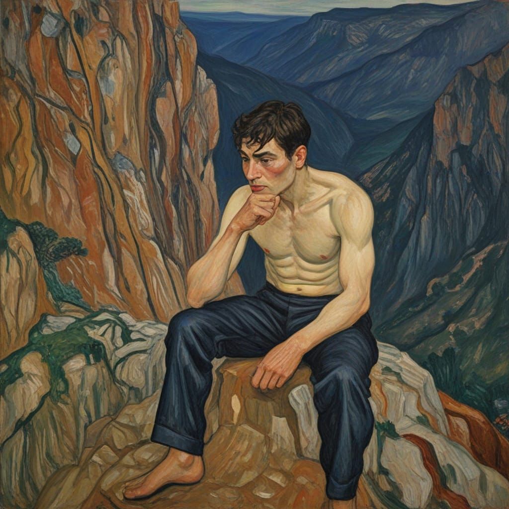 This striking image depicts a figure on golden mountains, gripping conflict and radiating a somber presence. Rendered in a style reminiscent of expressionist masters, it evokes raw emotion and psychological depth.