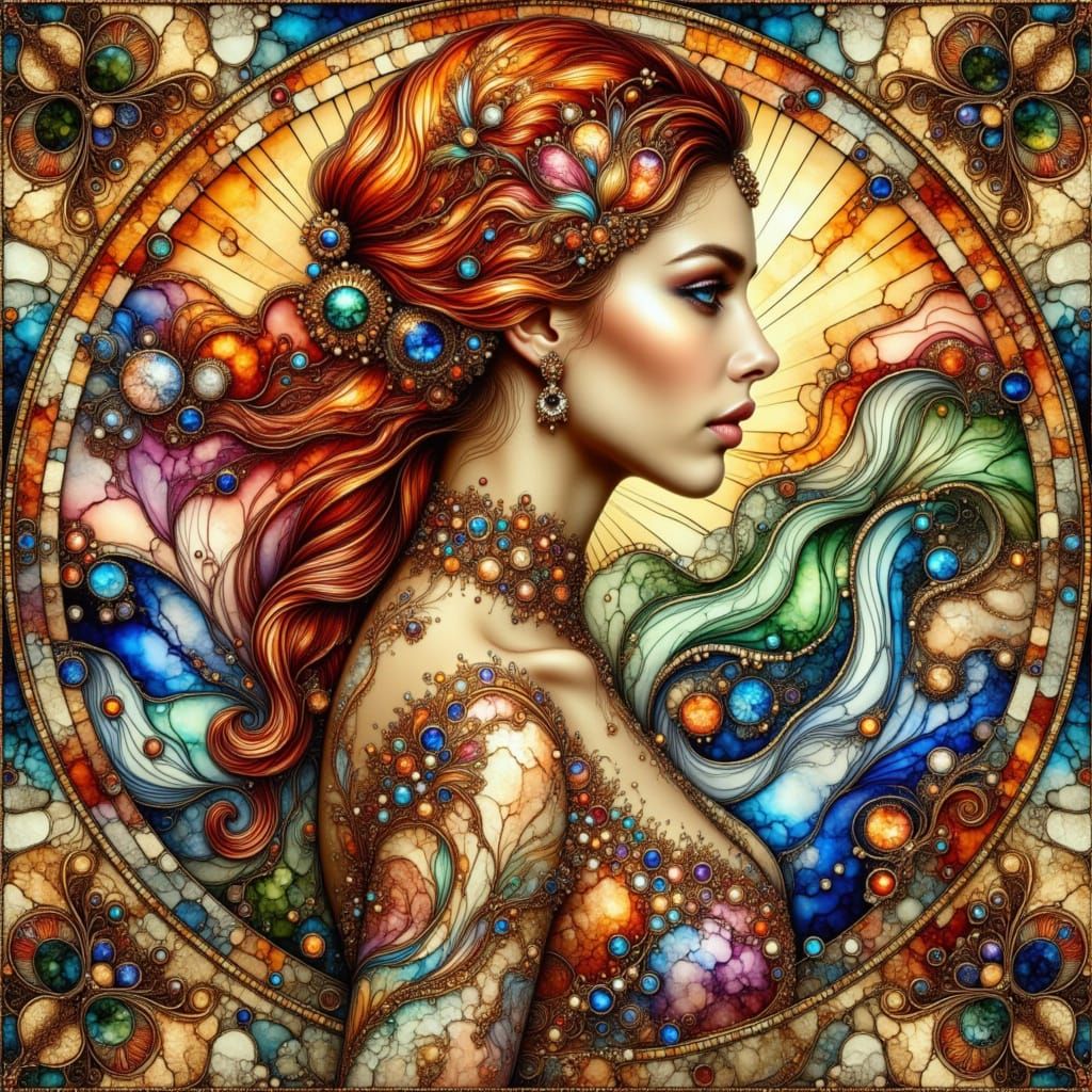 A striking picture of a beautiful woman with auburn hair and lacework patterns, against a sunset and waterfall background. The image has a stained-glass effect with vibrant colors and metallic accents.
