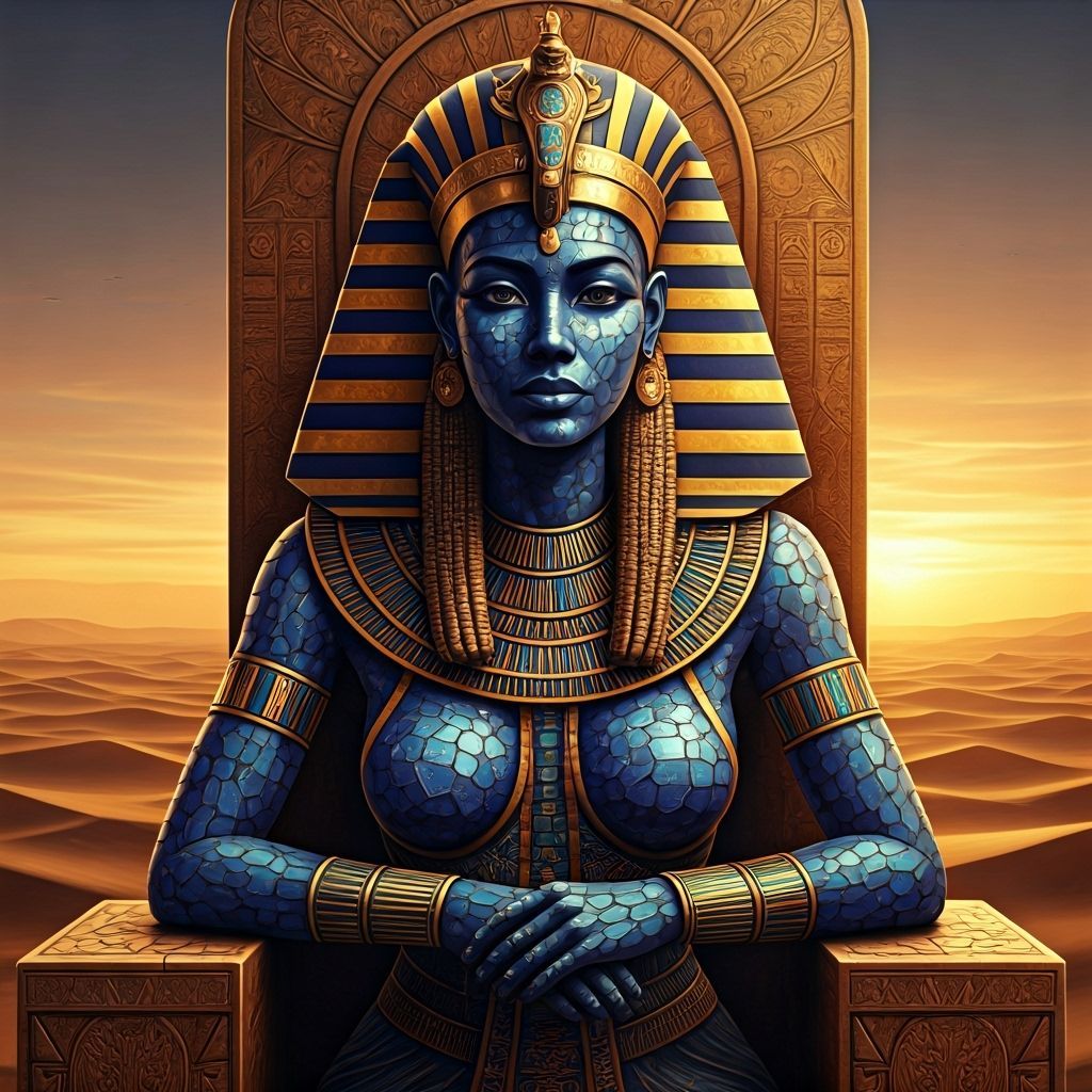 This striking image showcases a hyperrealistic sculpture of an ancient Egyptian-inspired queen. Crafted from polished sea glass in deep blues and golds, she sits regally on a mosaic throne against a desert sunset.