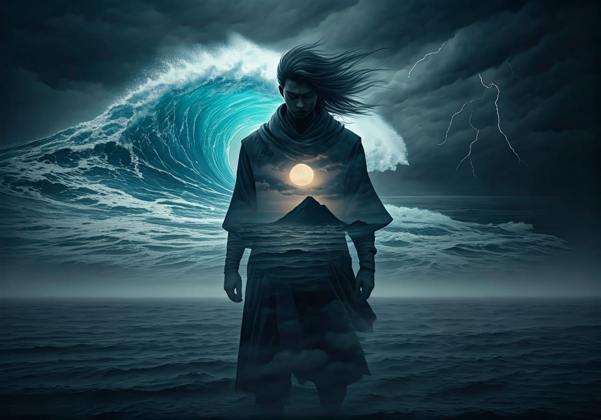 A dramatic image of a samurai warrior filled with crashing waves and stormy skies. Norse runes glow subtly, with a spaceship hinted within him, all set against a desaturated coastline in a fusion of mythic and sci-fi elements.