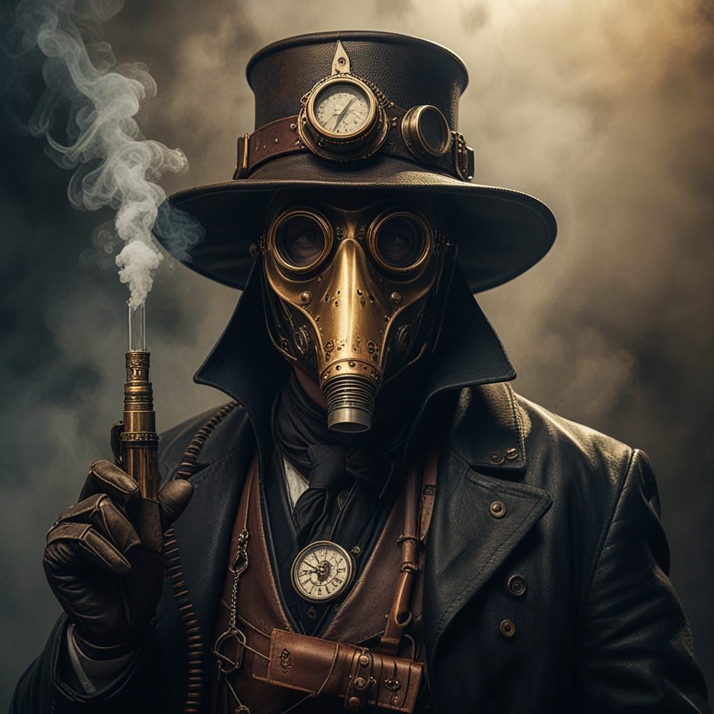 This image shows a medium shot of a plague doctor in steampunk style. The figure holds a brass syringe and satchel, with glowing bronze lenses and a polished brass beak, in a foggy, cinematic atmosphere.