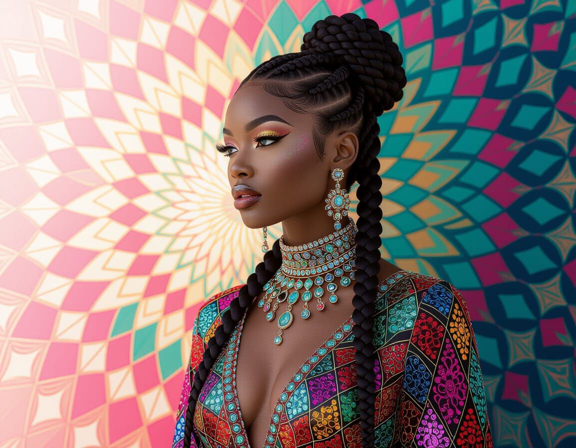This image shows a black woman in an elegant dress and updo, adorned with stained glass jewelry. The background features swirling fractal discs and dramatic lighting, in a photorealistic style.