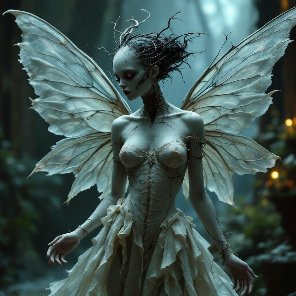 A striking picture of a porcelain fairy with a Frankenstein-inspired body, visibly stitched together. She wears a tattered Victorian gown, her stitched wings spread wide against a haunting backdrop in a dark, gothic style.