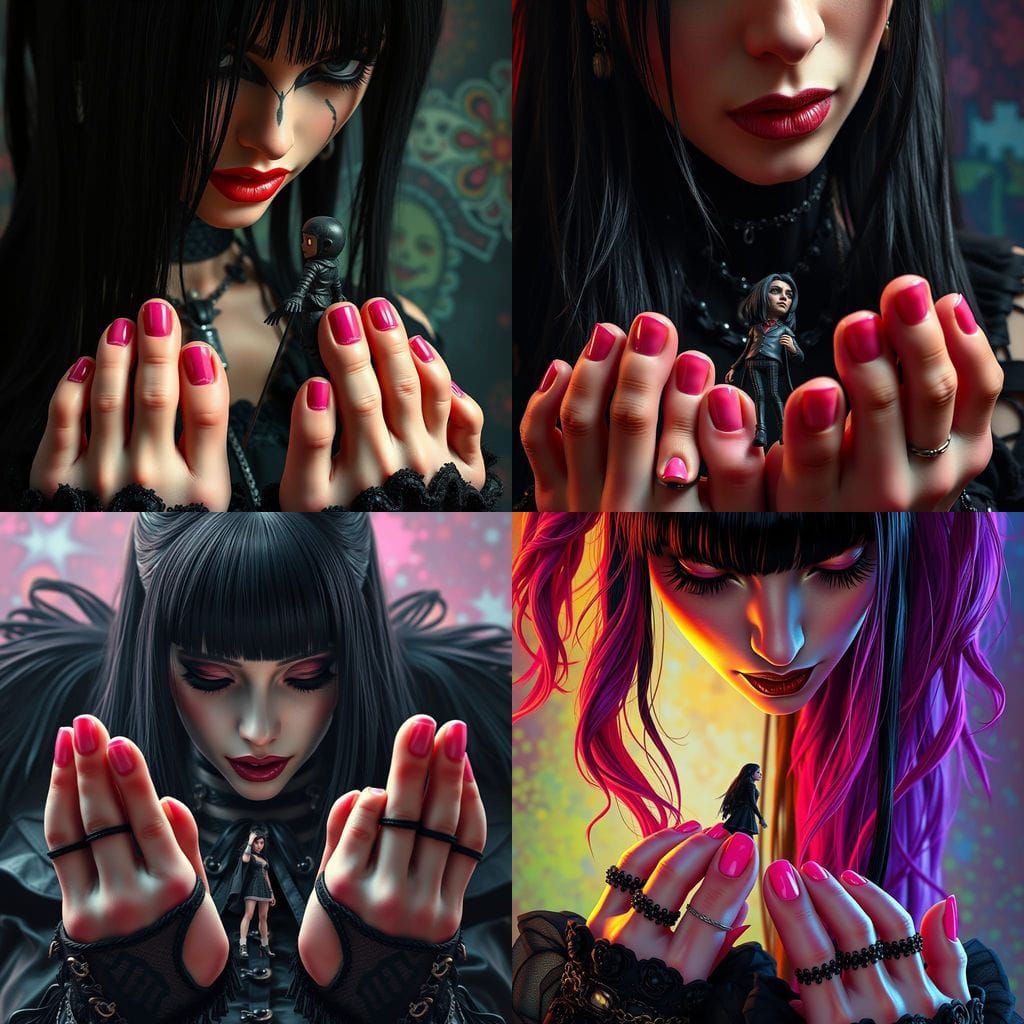 A hyperrealistic image of a 100ft tall goth giantess looking down at a tiny man pinned between her toes. The giantess wears black goth clothing and has pink toenails.